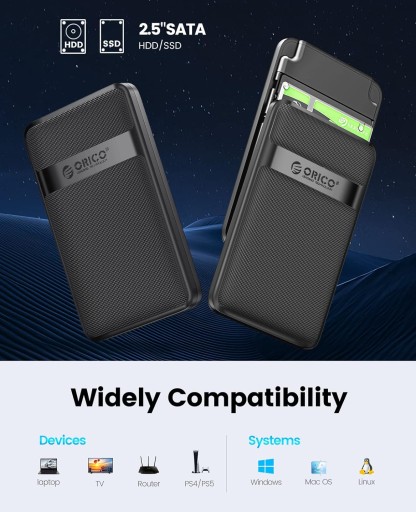 Kompatybilność Obudowę SSD 2.5 można podłączyć do urządzeń USB, takich jak komputer PC, laptop, MacBook, konsola do gier, smart TV, kompatybilna z większością systemów Windows, Linux, Mac OS 8.0 i nowszych, kompatybilna z większością 2,5" 7 mm/9,5 mm SATA III/II /I Dyski twarde SSD o pojemności do 6 TB.