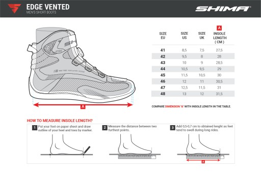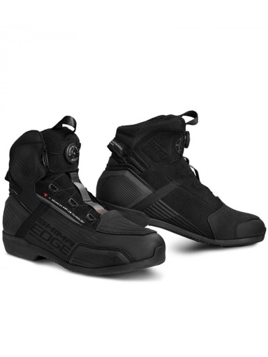 Shima Edge WP to przeznaczone na miejskie wypady oddychające buty motocyklowe. Wodoodporna membrana NextDry która nie przepuszcza cząsteczek wody nawet podczas największej ulewy. Miejscowa perforacja oraz przewiewna konstrukcja języka utrzymuje odpowiednią cyrkulację wewnętrzną zapobiegając nadmiernemu poceniu się stopy oraz powstawaniu nieprzyjemnych zapachów. Za bezpieczeństwo odpowiadają protektory kostek SAP wykonany z termoplastycznego tworzywa TPR o dużej odporności na przetarcia. Dodatkowo obszar pięty oraz palców został wzmocniony dzięki czemu buty zapewniają kompleksową ochronę miejsc najbardziej narażonych na urazy. Przód buta wyposażony został również we wstawkę ułatwiającą operowanie dźwignią zmiany biegów. Odblaskowe elementy zwiększają widoczność w kiepskich warunkach pogodowych i po zmroku. Zupełnie nowy typ podeszwy wykonany został w autorskiej technologii ESG, która dzięki specjalnemu ukształtowaniu powierzchni znacznie zwiększa przyczepność. Ważną rolę pełni również klin który ułatwia przyjęcie najbardziej optymalnej pozycji stopy na podnóżku. Pasek umieszczony w tylnej części ułatwia zakładanie butów a innowacyjny system sznurowania Atop umożliwia wiązanie obuwia przy użyciu wyłącznie jednej ręki nawet w rękawicy.