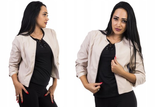 Bardzo efektowna marynarka z okrągłym dekoltem. Rękawy 3/4. Bardzo kobieca. Specjalne cięcia sprawiają, że świetnie leży na sylwetce. W całości wykonana z materiału imitującego skórę.