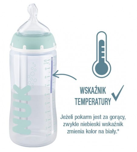 Bezpieczne karmienie dzięki wskaźnikowi temperatury na butelce zmienia kolor z niebieskiego na biały,