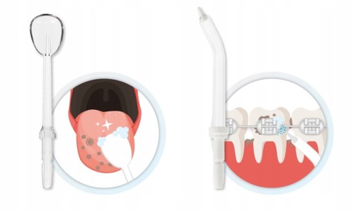 ✔️ 6 końcówek w zestawie: 2 x standardowa, skrobaczka do języka, dysza ortodontyczna, dysza zraszacz kieszeni przyzębia, końcówka do nosa