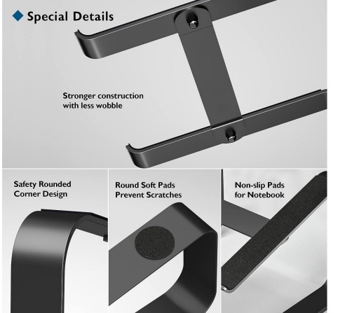 - Zalety zdrowotne: ergonomiczny stojak na laptopa pomaga wyeliminować bóle pleców i bezwładność. Nasz stojak na laptopa bez problemu podnosi laptop na wyższy poziom, odległość do 14 cm od biurka i przechyla się o 14 stopni, aby osiągnąć wysokość oczu, aby zoptymalizować postawę i komfort oraz złagodzić ból karku i ramion