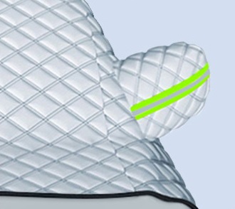 Po obu stronach znajdują się osłony na lusterka, które są przyszyte materiałowymi pasami, oraz posiadają elementy odblaskowe w kolorze ZIELONYM.