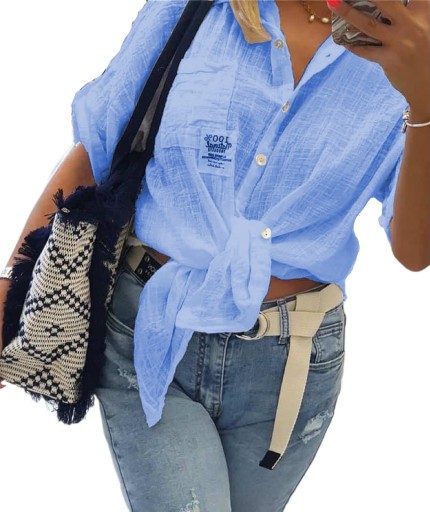 Stylowa bluzka koszulowa z rękawem. Bluzeczka wykonana z przyjemnego lekkiego materiału. Koszula wykonana z materiału przypominającego strukturą i właściwościami len. Sprawdzi się w połączeniu dżinsami oraz ze spódnicą.