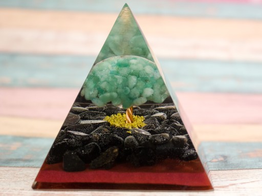 PIRAMIDKA Z ŻYWICY ORGONIT AMAZONIT KWARC DYMNY MORION DOBRE SAMOPOCZUCIE 7 cm