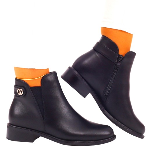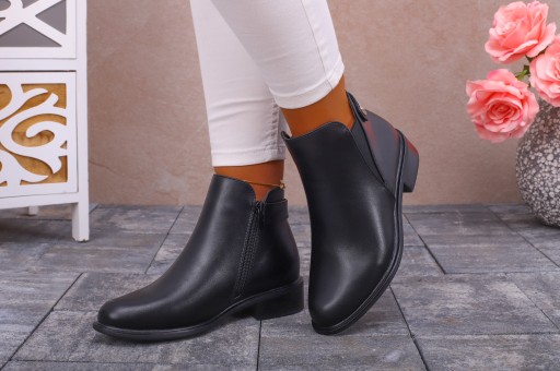 Damskie, wsuwane botki w kolorze czarnym. Posiadają zapięcie na suwak, co umożliwia łatwe zakładanie. Stabilna, gruba podeszwa dobrze amortyzuje stopę oraz chroni przed zimnem. Wykonane z dobrych jakościowo materiałów. Prosty fason sprawia, że pasują do wielu stylizacji.