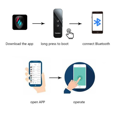 -Obsługa Bluetooth: Połącz się z telefonem przez Bluetooth, zezwól na odległość transmisji bezprzewodowej do 10 metrów, a odległość rozpoznawania mowy wynosi 2 metry, a następnie rozpocznij tłumaczenie w czasie rzeczywistym