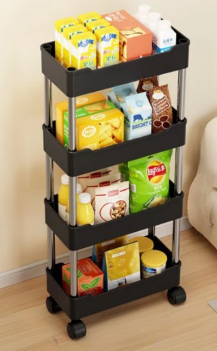 Regał mobilny w kolorze czarnym na kółkach, to prosty i praktyczny dodatek do Twojego domu! Pozwoli Ci zorganizować przestrzeń oraz oszczędzić miejsce w szafkach. Sprawdzi się w każdym pomieszczeniu, w którym potrzebujesz dodatkowej przestrzeni, dzięki swojemu estetycznemu wyglądowi, postawisz go w kuchni, salonie, sypialni czy łazience, idealnie sprawdzi się również do salony kosmetycznego. Odsłonięte półki sprawią, ze będziesz miał szybki dostęp do niezbędnych rzeczy, a kółka pozwolą Ci z łatwością zmienić jego miejsce, bez zbędnego używania siły!