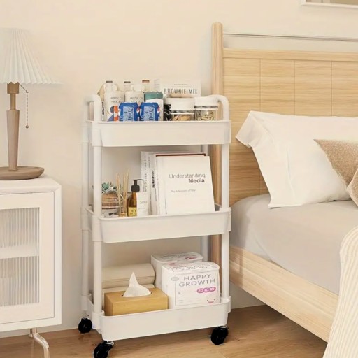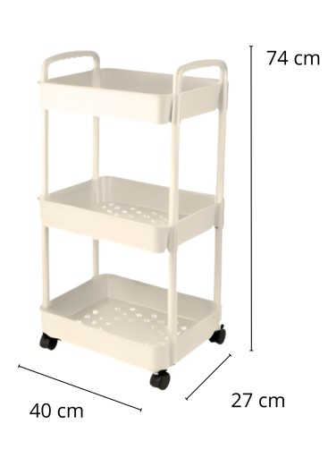 Regał mobilny w kolorze ecru na kółkach, to prosty i praktyczny dodatek do Twojego domu! Pozwoli Ci zorganizować przestrzeń oraz oszczędzić miejsce w szafkach. Sprawdzi się w każdym pomieszczeniu, w którym potrzebujesz dodatkowej przestrzeni, dzięki swojemu estetycznemu wyglądowi, postawisz go w kuchni, salonie, sypialni czy łazience, idealnie sprawdzi się również do salonu kosmetycznego. Odsłonięte półki sprawią, ze będziesz miał szybki dostęp do niezbędnych rzeczy, a kółka pozwolą Ci z łatwością zmienić jego miejsce, bez zbędnego używania siły!
