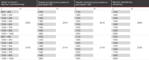 Otwór w murze ( mm ) : (1930 = 1030 + 900) szerokości x 2150 wysokości