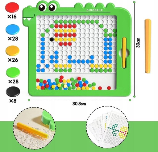 Tablica Magnetyczna MagPad od marki WOOPIE otwiera przed Twoim dzieckiem drzwi do świata kreatywności i edukacji. Dzięki tej wyjątkowej tablicy Twoje dziecko ma okazję tworzyć niepowtarzalne wzory i mozaiki. W skład zestawu, oprócz samej tablicy, wchodzi magnetyczny pisak oraz 110 magnetycznych guzików do tworzenia. Ograniczeniem jest jedynie wyobraźnia i kreatywność - maluch może swobodnie układać wzory według własnych pomysłów. Guziki są mocne i trwałe, a układanie jest intuicyjne i proste. Ten zestaw to nie tylko zabawa, ale też doskonałe narzędzie do nauki i rozwijania zdolności manualnych, koncentracji oraz wyobraźni.
