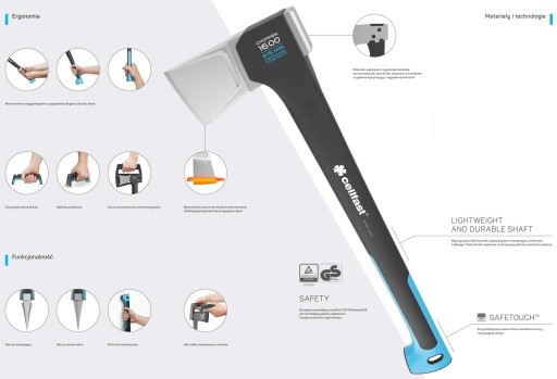 Zastosowany system SAFETOUCH to miękka, antypoślizgowa powierzchnia pokrywająca znaczną część trzonka. Dzięki temu produkt trzyma się bardzo pewnie i wygodnie w dłoni, a podczas pracy siekiera nie wyślizguje się i nie pozostawia pęcherzy na dłoniach.