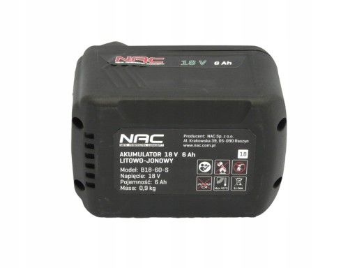 Akumulator przeznaczony jest dla narzędzi akumulatorowych NAC z napięciem 18 V.