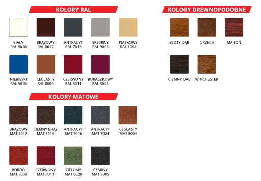 Szeroka gama kolorystyczna z palety „RAL” umożliwiająca aranżacje w dowolny i niezależny wystrój. Istnieje możliwość wyboru kolorów DREWNOPODOBNYCH.