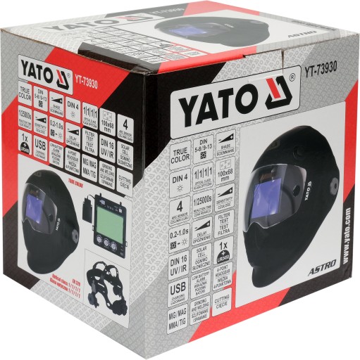 Przyłbica spawalnicza YATO Astro z filtrem samościemniającym typu TRUE COLOR, umożliwiającym obserwację łuku spawalniczego w rzeczywistych kolorach.