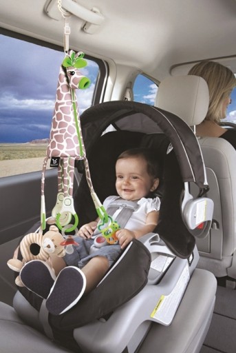 - 4 różne zaczepy na zabawki, przytwierdzone do nóżek zawieszki do samochodu, nie pozwolą na zgubienie smoczka, zabawki czy przytulanki w trakcie podróży,