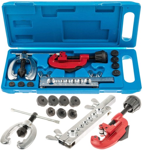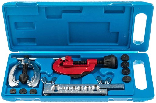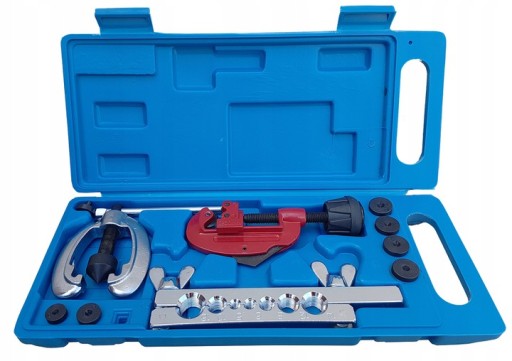 Zestaw do zarabiania aluminiowych i miedzianych przewodów hamulcowych oraz do wykonywania stożkowych kołnierzy połączeniowych.