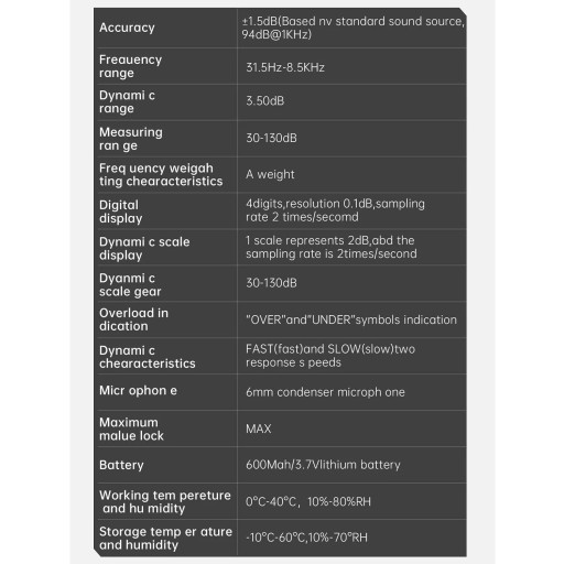 Dokładność: ±1,5dB (w oparciu o standardowe źródło dźwięku, 94dB@1KHz)