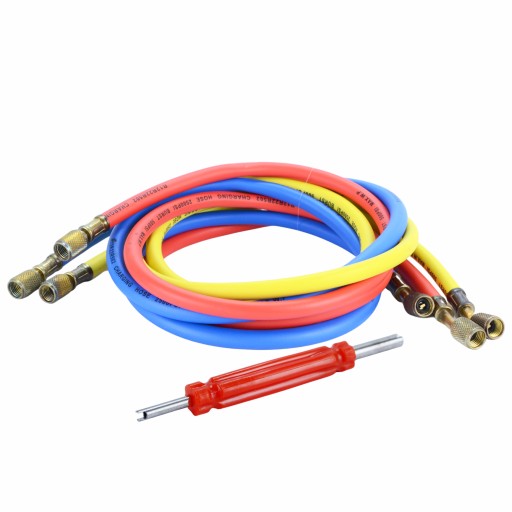 W zestawie znajdziesz podwójny zegar z wziernikiem, dwa manometry ze skalą na czynniki R22, R134 oraz R12, trzy różnokolorowe węże o długości około 140 cm, kluczyk do odkręcania zaworów, zawory kulkowe oraz zawór do butli klimatyzacji R134. To kompleksowe wyposażenie, które pozwoli Ci profesjonalnie przeprowadzić różnego rodzaju prace związane z klimatyzacją.