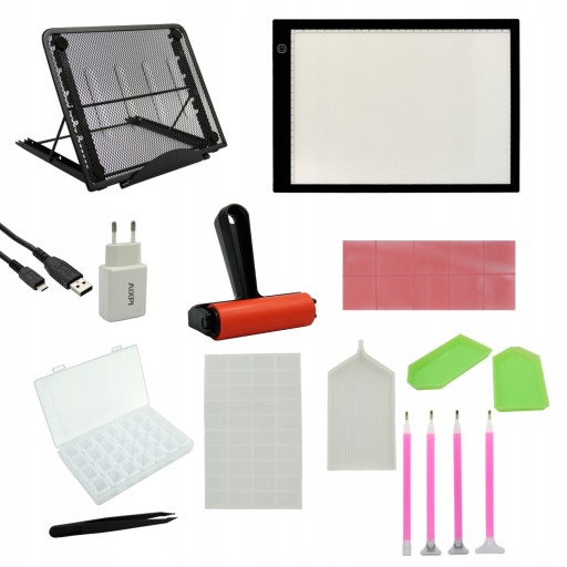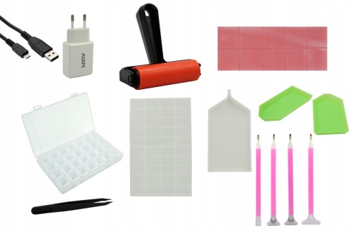 Zestaw składa się z dodatkowych elementów, które ułatwią pracę nad mozaikami w technice Diamond Painting, czyli Haftu Diamentowego. Wyklejanie obrazków diamentowych stanie się wygodne i praktyczne. Łatwo uporządkujesz diamenty a praca nad obrazem z tym zestawem to czysta przyjemność.