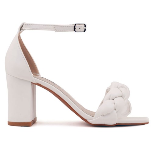 Sandały damskie na obcasie typu słupek. Z paskiem plecionym w warkocz wokół palców. Pięta zakryta. Kostkę oplata cienki pasek zapinany na sprzączkę. Wykonane z pięknie nabłyszczanej ekoskóry, wkładka skórzana. Sandały na słupku fenomenalnie prezentują się w stylizacjach na wesele albo imprezę.