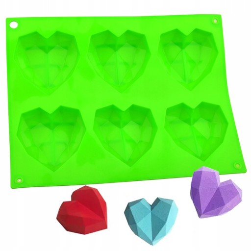 Forma silikonowa do wyrobu domowych czekoladek i pralinek z wgłębieniami w kształcie geometrycznych serc. Produkt przeznaczony jest także do tworzenia galaretek bądź kostek lodu.
