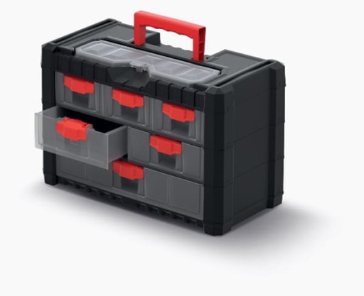 Praktyczny stojący organizer z wysuwanymi szufladkami to ergonomiczne rozwiązanie dla ludzi ceniących ład i porządek w garażu, warsztacie oraz piwnicy majsterkowicza. Nic nie jest takim marnotrawieniem czasu jak szukanie kołków rozporowych, wkrętów do drewna i metalu lub śrub, nakrętek i podkładek. Organizer daje możliwość posegregowania i utrzymania w porządku wymienionych rzeczy co pozwala zaoszczędzić czas a co za tym idzie pieniądze. Dzięki otworom umieszczonym w tylnej części obudowy organizer można zawiesić na ścianie, z kolei solidna rączka umożliwia jego wygodne przenoszenie. Nie dość, że ładny, to jeszcze trwały i solidnie wykonany przez polskiego poducenta.