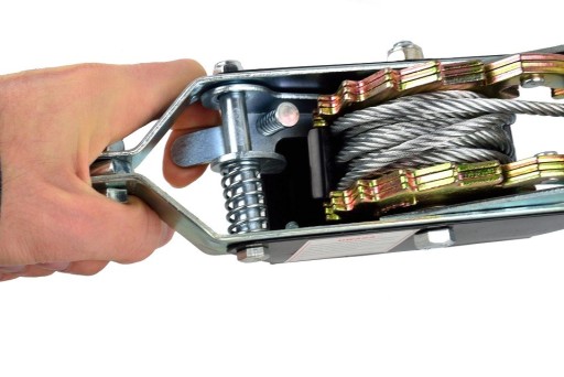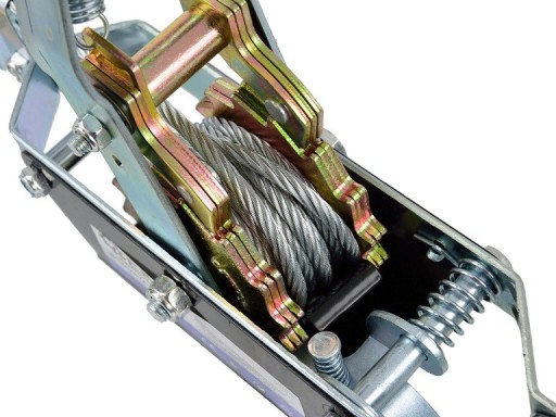 Ręczna wciągarka linowa pozioma. Wciągarka wyposażona została w 2-trybowy mechanizm blokujący, stalową line o średnicy 4,5 mm i długości 2,5 m, co w połączeniu z wytrzymałymi hakami generuje siłę uciągu na poziomie 2000 kg.