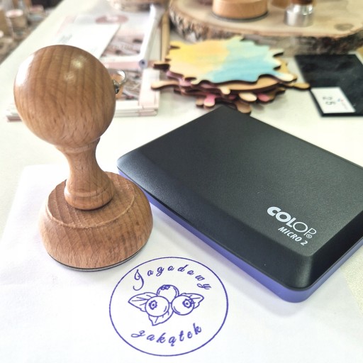 Tradycyjna pieczątka z grawerowanym logo w komplecie z poduszką z tuszem idealna do stemplowania pudełek, toreb papierowych oraz pojemników na żywność.