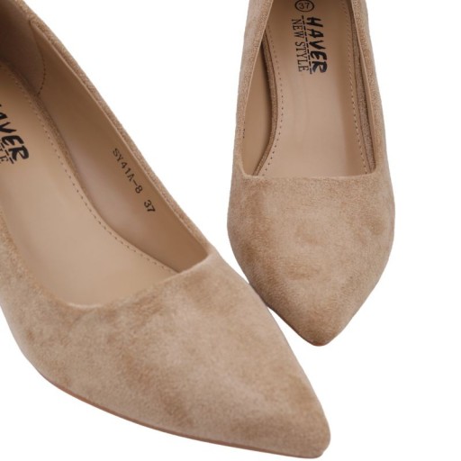Czółenka damskie z noskiem w szpic, osadzone na prostym obcasie typu słupek-7,5 cm. Wsuwane, wykonane z ekozamszu. Wkładka skórzana. Dzięki klasycznemu fasonowi i gładkiemu wzorowi założysz je na wiele okazji.