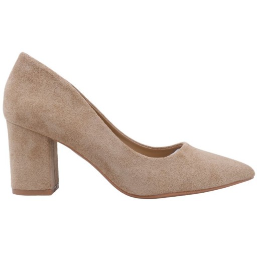 Czółenka damskie z noskiem w szpic, osadzone na prostym obcasie typu słupek-7,5 cm. Wsuwane, wykonane z ekozamszu. Wkładka skórzana. Dzięki klasycznemu fasonowi i gładkiemu wzorowi założysz je na wiele okazji.