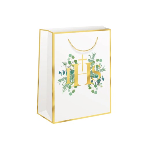 Efektowna torebka prezentowa będzie wspaniałym opakowaniem dla podarunków z okazji Pierwszej Komunii Świętej. Napis IHS i inne ornamenty w tradycyjnym złotym kolorze, idealnie podkreśla wiosenna świeżość zielonych gałązek eukaliptusa.