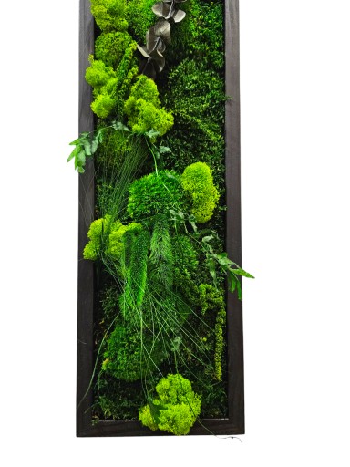 Nasze obrazy z mchu to połączenie mchu poduszkowego, mchu płaskiego i roślin stabilizowanych w różnych odcieniach zieleni. Znajdą tu Państwo egzotyczne amarantusy, eukaliptusy, paprocie. Wykonane z dbałością o każdy szczegół tworzą efekt dżungli 3D.