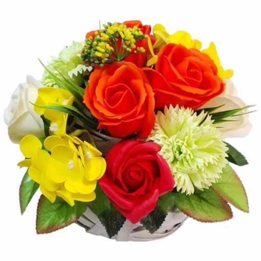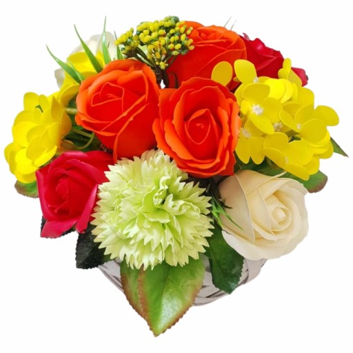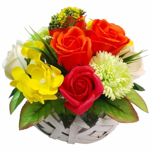 Na sprzedaż oferujemy kompozycję kwiatową - bukiet z kwiatami mydlanymi, które nie tylko udekorują wnętrze, ale również zapełnią je delikatnym i przyjemnym zapachem. Kompozycja została wykonana z wysokiej jakości materiałów, co gwarantuje trwałość i estetyczny wygląd.