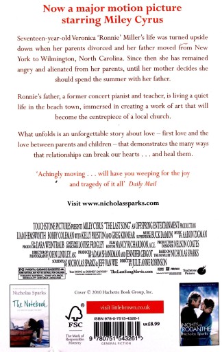 Seventeen-year-old Veronica 'Ronnie' Miller's life was turned upside-down when her parents divorced and her father moved from New York City to Wilmington, North Carolina. Three years later, she remains angry and alienated from her parents, especially her father . . . until her mother decides it would be in everyone's best interest if she spent the summer in Wilmington with him. Ronnie's father, a former concert pianist and teacher, is living a quiet life in the beach town, immersed in creating a work of art that will become the centerpiece of a local church. The tale that unfolds is an unforgettable story about love in its myriad forms - first love, the love between parents and children - that demonstrates, as only a Nicholas Sparks novel can, the many ways that deeply felt relationships can break our hearts . . . and heal them.