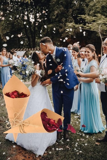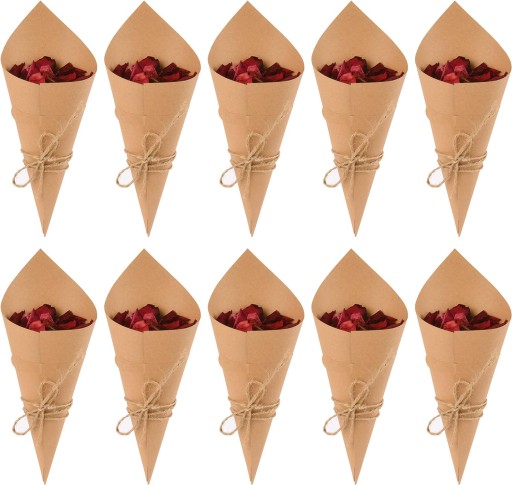 - Opakowanie 50 rożków konfetti w kształcie stożka z papieru kraft, rozmiar karty 15 x 15 cm, zawsze wygląda świetnie i stylowo na przyjęciu weselnym.