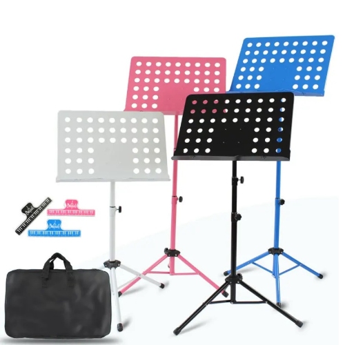 ♫ Składany pulpit na nuty z możliwością regulacji wysokości. Posiada dwa chwytaki przytrzymujące nuty/kartki, dzięki czemu nie spadną nieoczekiwanie z pulpitu. Zestaw zawiera również pokrowiec dzięki czemu pulpit można zabrać ze sobą. Przydatnym elementem zestawu jest również klips, poprawiający komfort użytkowania książki z nutami.