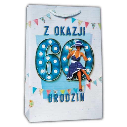 Elegancka torebka prezentowa z dopasowanym śmiesznym napisem z okazji 60 urodzin. Torebka wykonana z grubego, lakierowanego papieru.
