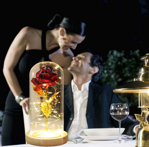 Ta precyzyjnie zrobiona róża, symbol miłości, została umieszczona w szklanej, pięknej kopule, przez którą widać cały czas jej piękno, nawet po ciemku, gdyż rozświetla ją 20 światełek LED , którymi jest oplatana.
