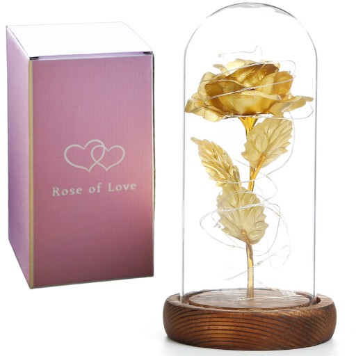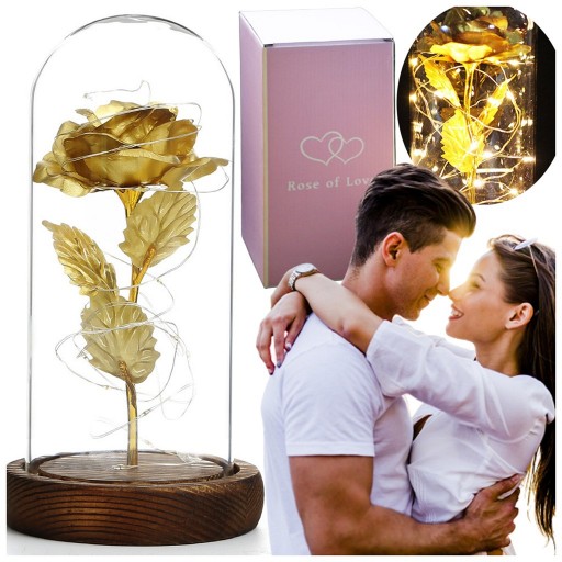 PIĘKNA ZŁOTA SZTUCZNA WIECZNA RÓŻA OŚWIETLONA W SZKLE PREZENT DLA KOBIETY