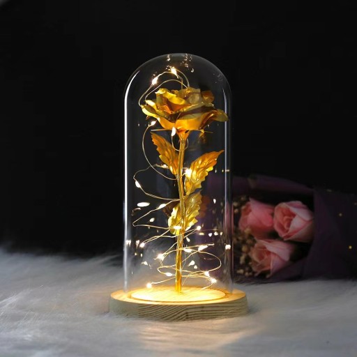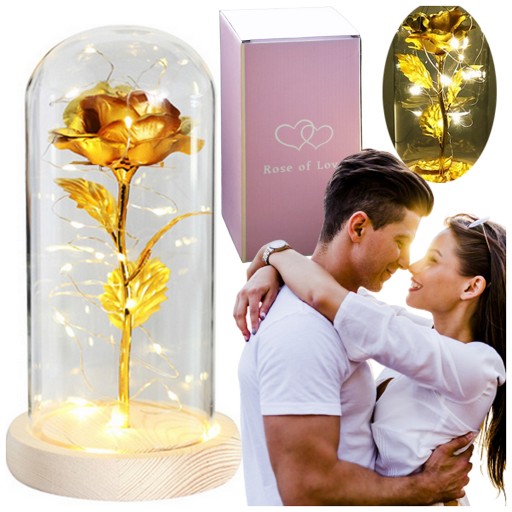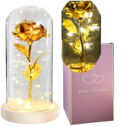 ZŁOTA SZTUCZNA WIECZNA RÓŻA W SZKLE Z LED DIODY ŚWIATŁO PREZENT URODZINY