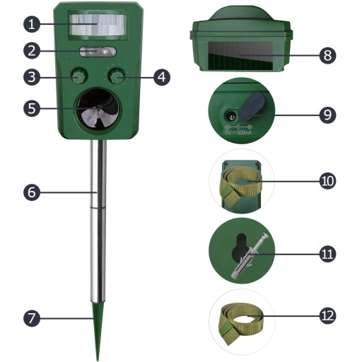 Odstraszacz posiada wbudowany akumulator, akumulator ładuje się w trakcie dnia przy pomocy panelu fotowoltaicznego który znajduje się u góry odstraszacza. Dodatkową opcją naładowania akumulatora jest podłączenie zasilacza 5V. Zasilacz nie jest dołączony do zestawu.