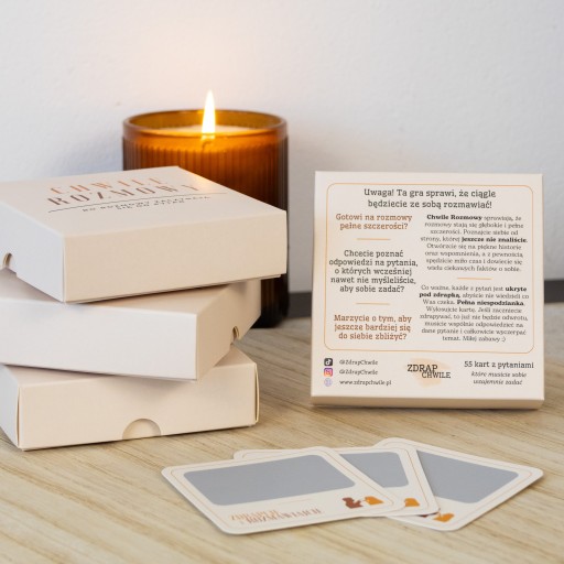 „Chwile rozmowy” to wyjątkowy zestaw 55 kart zdrapek, które zmienią każdy wieczór w niezapomnianą przygodę. Każda zdrapka kryje w sobie pytanie, które pobudzi ciekawość i rozwieje rutynę w Waszej relacji. Wrócicie do początkowych etapów Waszej relacji, a także zaplanujecie swoją wspólną przyszłość. To pytania, które sprawią, że ciągle będziecie ze sobą rozmawiać.