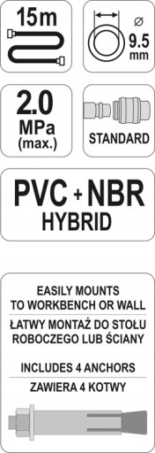 Przewód pneumatyczny HYBRYDOWY na zwijaku, długość 15m - długość przyłącza 60cm. Możliwość instalowania na ścianie lub podłodze. Wąż zakuty standardowymi szybkozłączami.