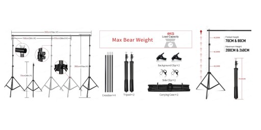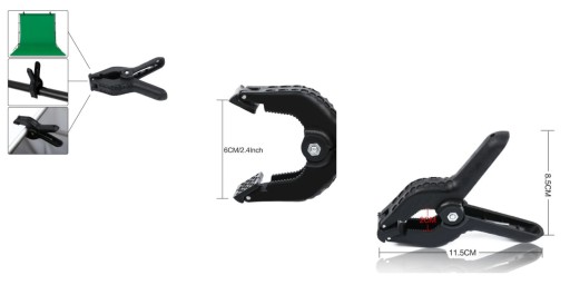 4x klamry: 2x boczny zacisk (side clip), dostosuj tło materiałowe do najlepszej pozycji. 2x mocny klips (background clips), zapobiegają wyślizgnięciu się tła.