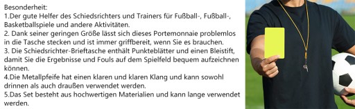 - Zestaw sędziów kontrolnych - nasz zestaw zawiera ograniczoną kartkę, żółtą kartkę, elektryczną kartę, długopis, dwa gwizdki i dwie żółte smycze, które mają zastosowanie do sędziów piłkarskich.