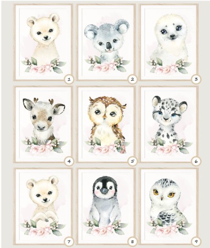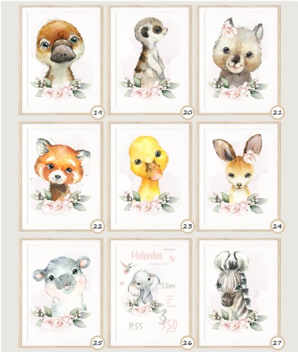Do wyboru36 plakatów ze zwierzętami, metryczka, oraz personalizacja.