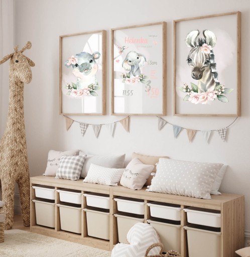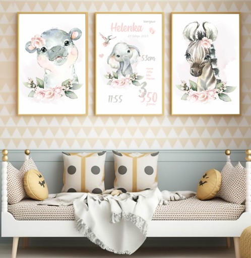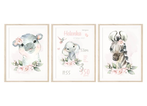 Zestaw 3 plakaty zwierzęta, imię dziecka, metryczka wzory A3 !!!