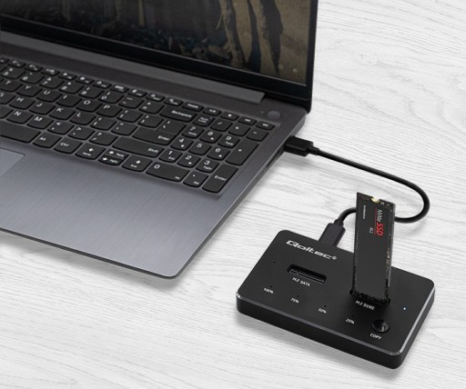Stacja jest kompatybilna z dyskami M.2 o interfejsie SATA oraz NVMe. Oferuje szybkość transmisji danych do 10 Gb/s. Dodatkowo stacja dysków marki Qoltec to urządzenie: