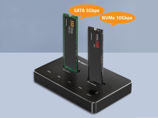Instalacja dysku SSD jest łatwa, szybka i nie wymaga posiadania żadnych specjalistycznych umiejętności technicznych. Jedyna czynność jaką należy wykonać to wsunąć dysk SSD NVMe lub SATA do stacji dokującej, wybrać na stacji odpowiedni dysk i podłączyć do odpowiedniego urządzenia.